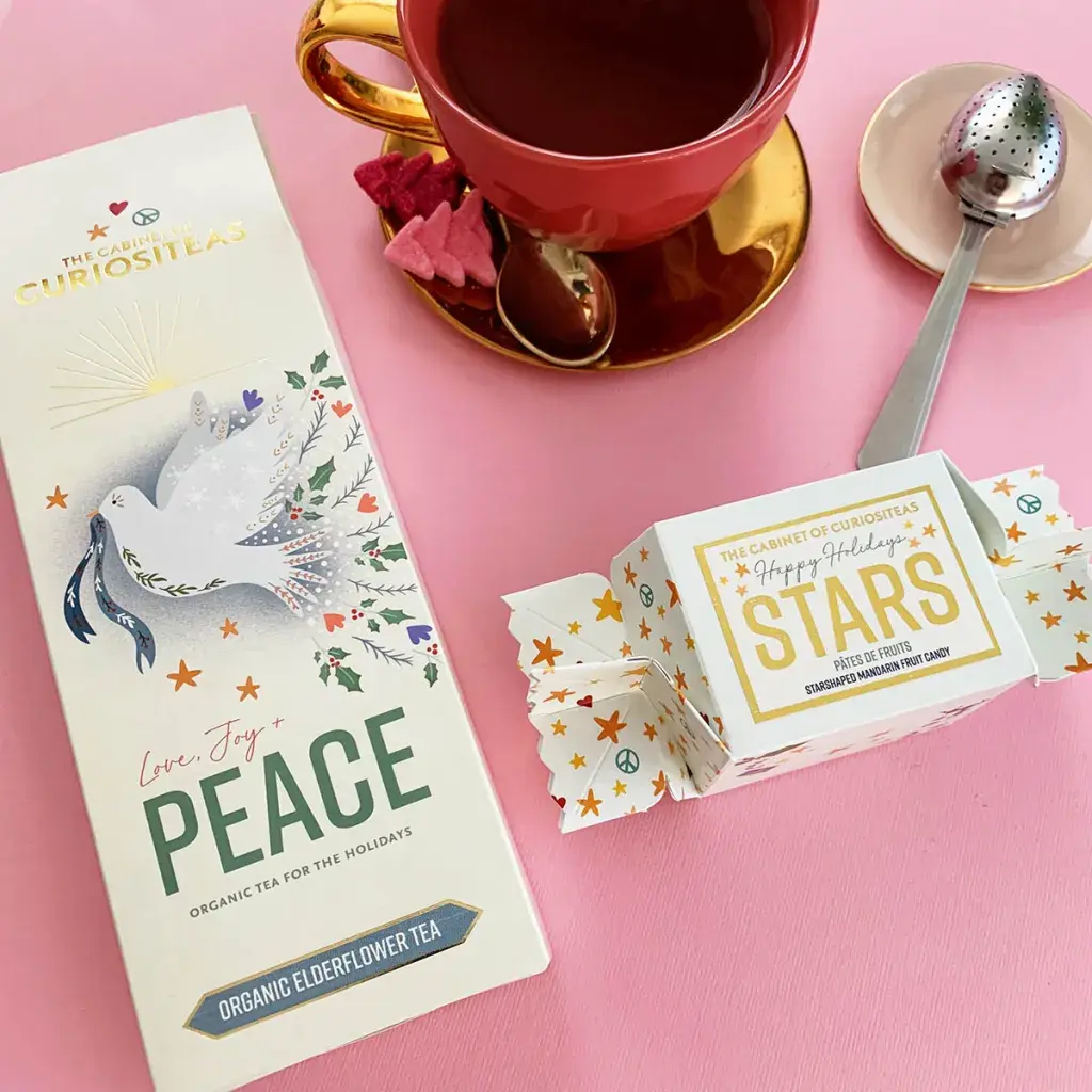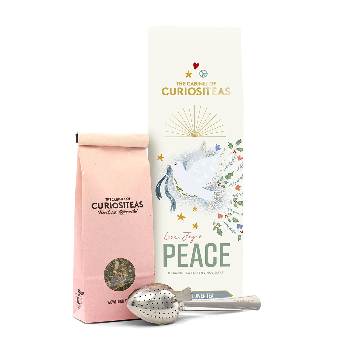 Onze kerstwens? Love, Peace & Joy! In deze giftbox vind je niet alleen een heerlijke losse thee (genoeg voor 25 kopjes) maar ook onze handige tea infuser!