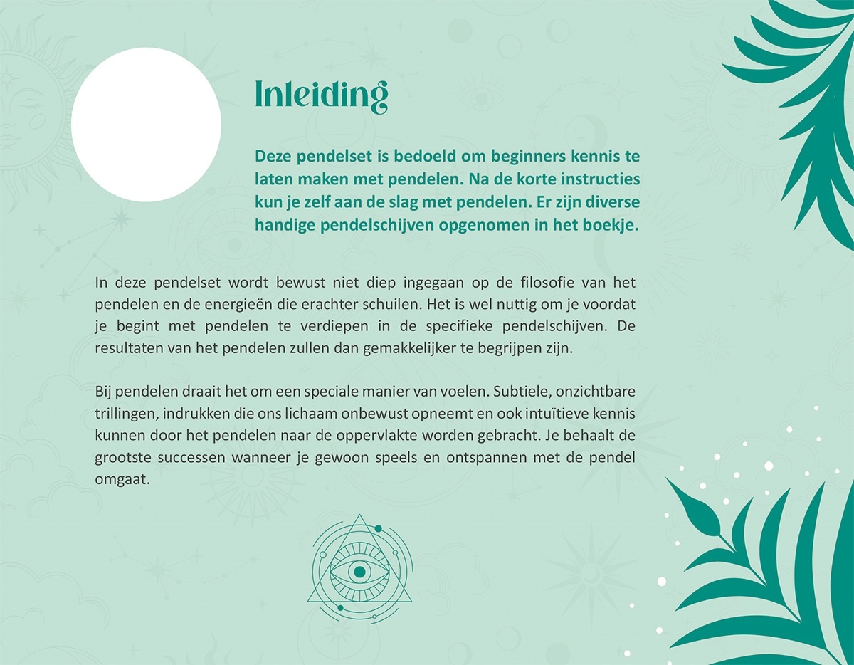 Een pendel is een sleutel naar je intuïtie. Subtiele, onzichtbare trillingen, indrukken die ons lichaam onbewust opneemt en ook intuïtieve kennis kunnen door het pendelen naar de oppervlakte worden gebracht. Deze pendelset bevat een pendel, korte instructies en handige pendelschijven zodat iedereen zelf kan leren pendelen!
