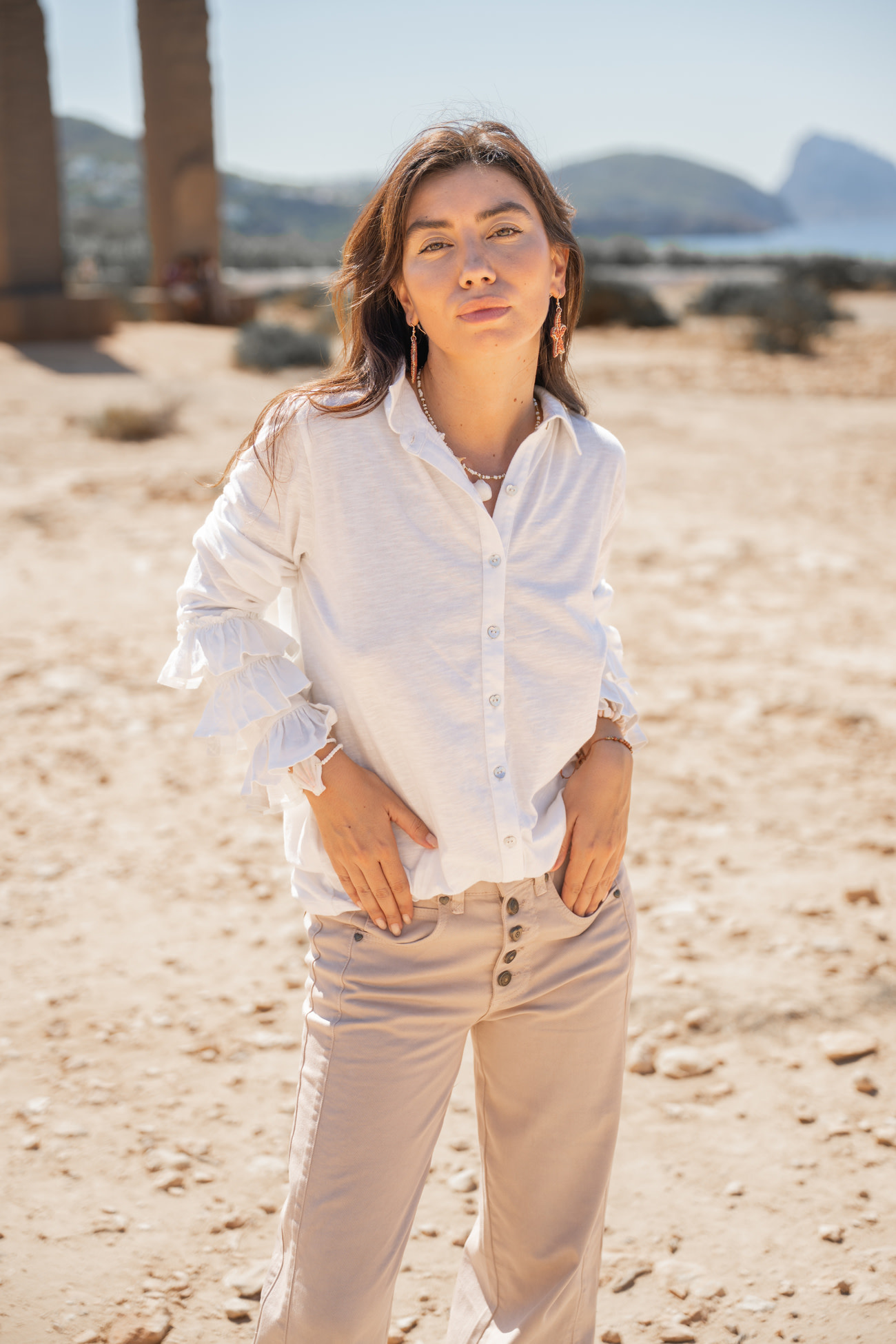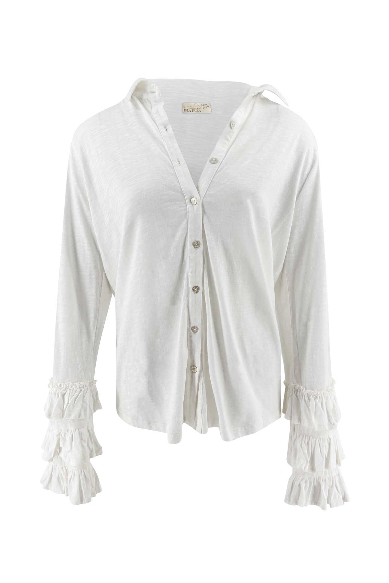 De Isla Ibiza Bonita Shirt Roza Cream uit de Romantic Soul collectie is een lichte blouse met verfijnde ruffles en een zachte uitstraling. De cream tint vormt een rustige basis en laat zich moeiteloos combineren met andere items uit de lijn.