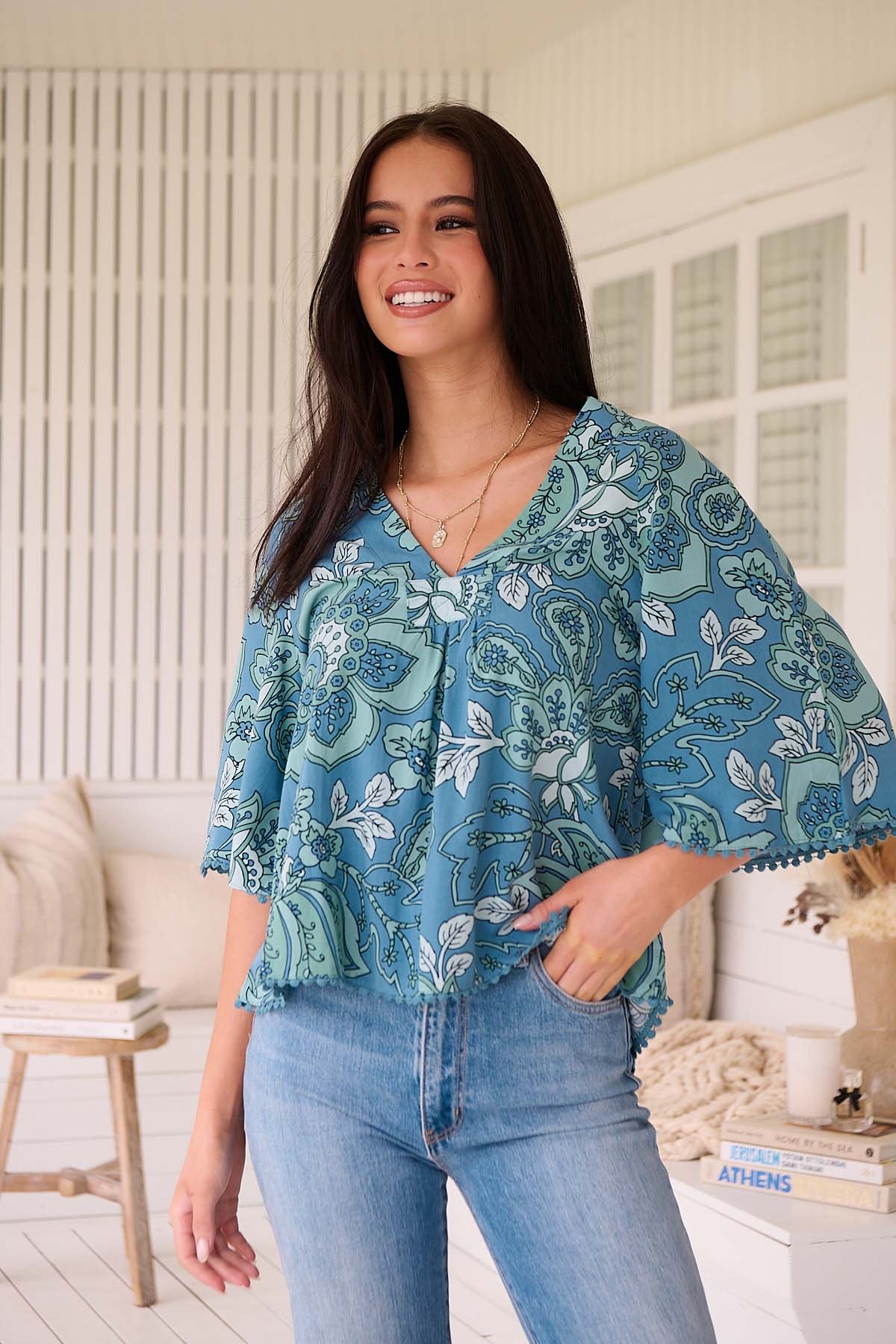 De top Serenade Gabriella van het merk Jaase is een losvallende top met een v-hals en korte wijdlopende mouwen.