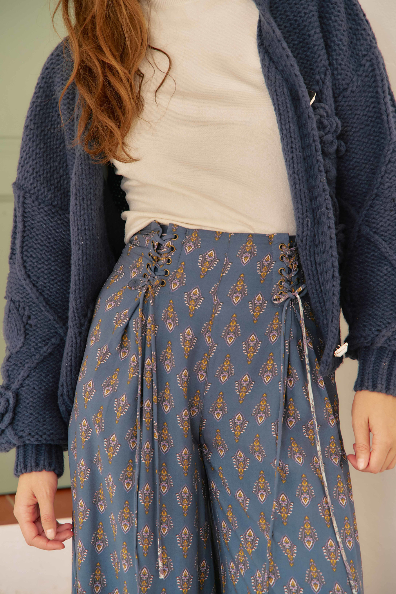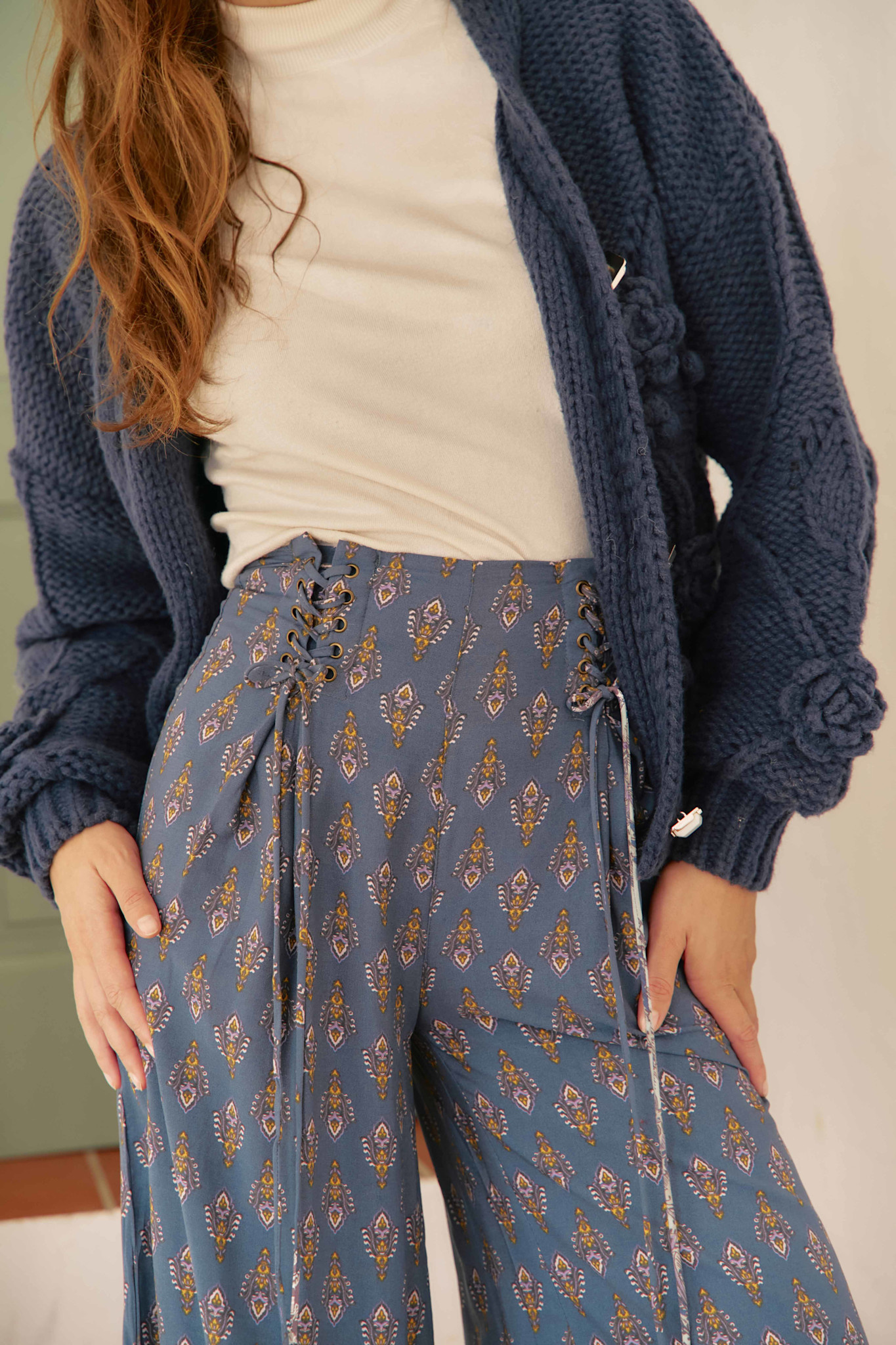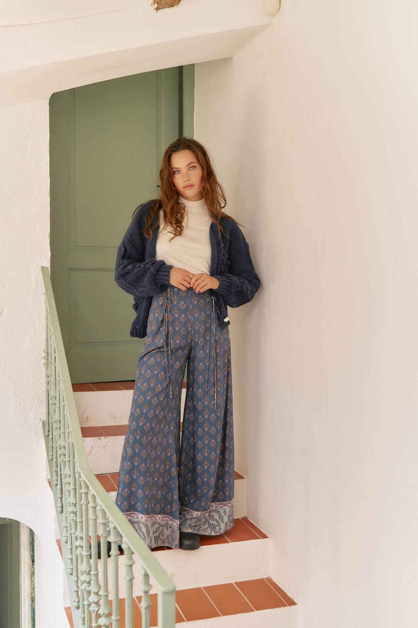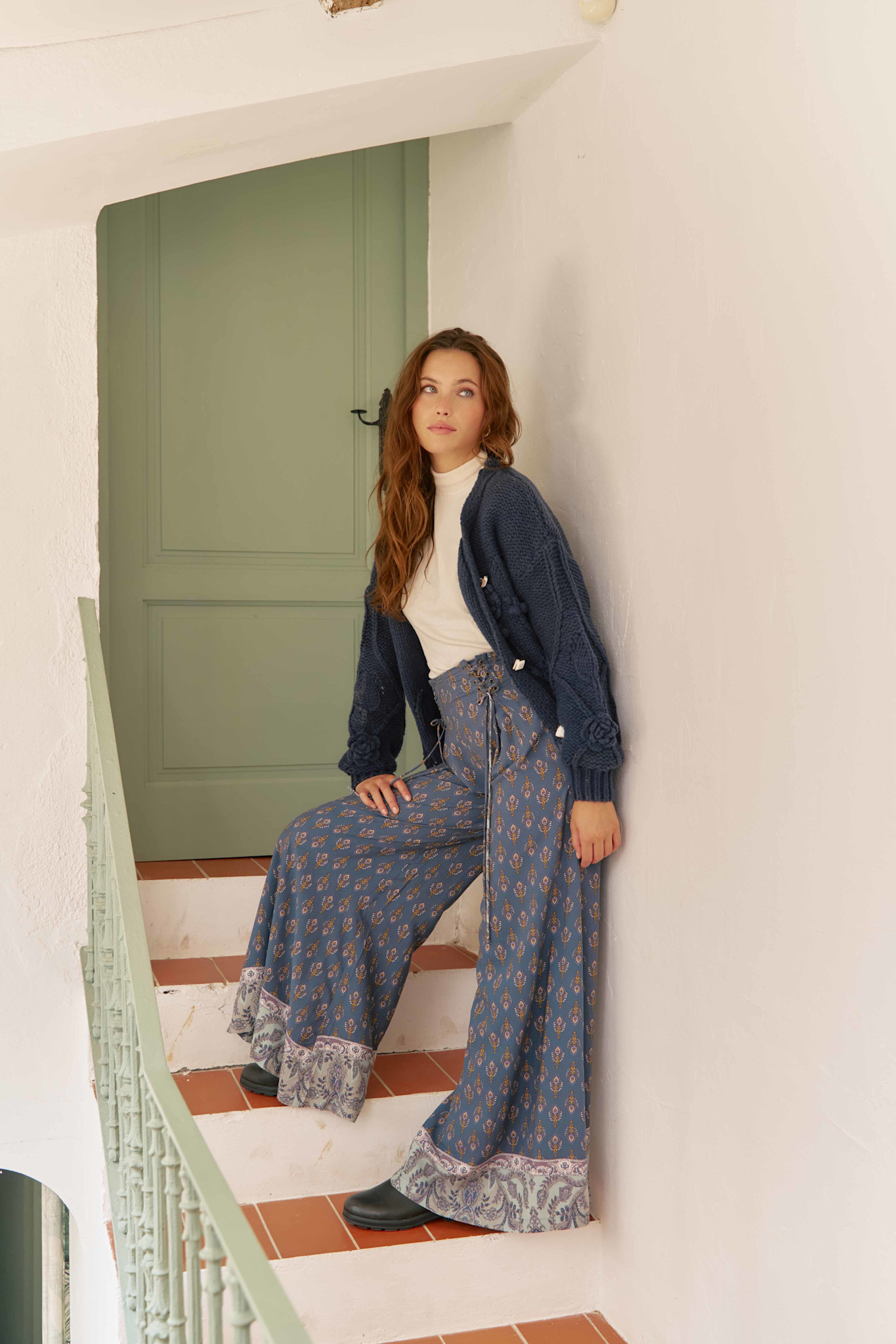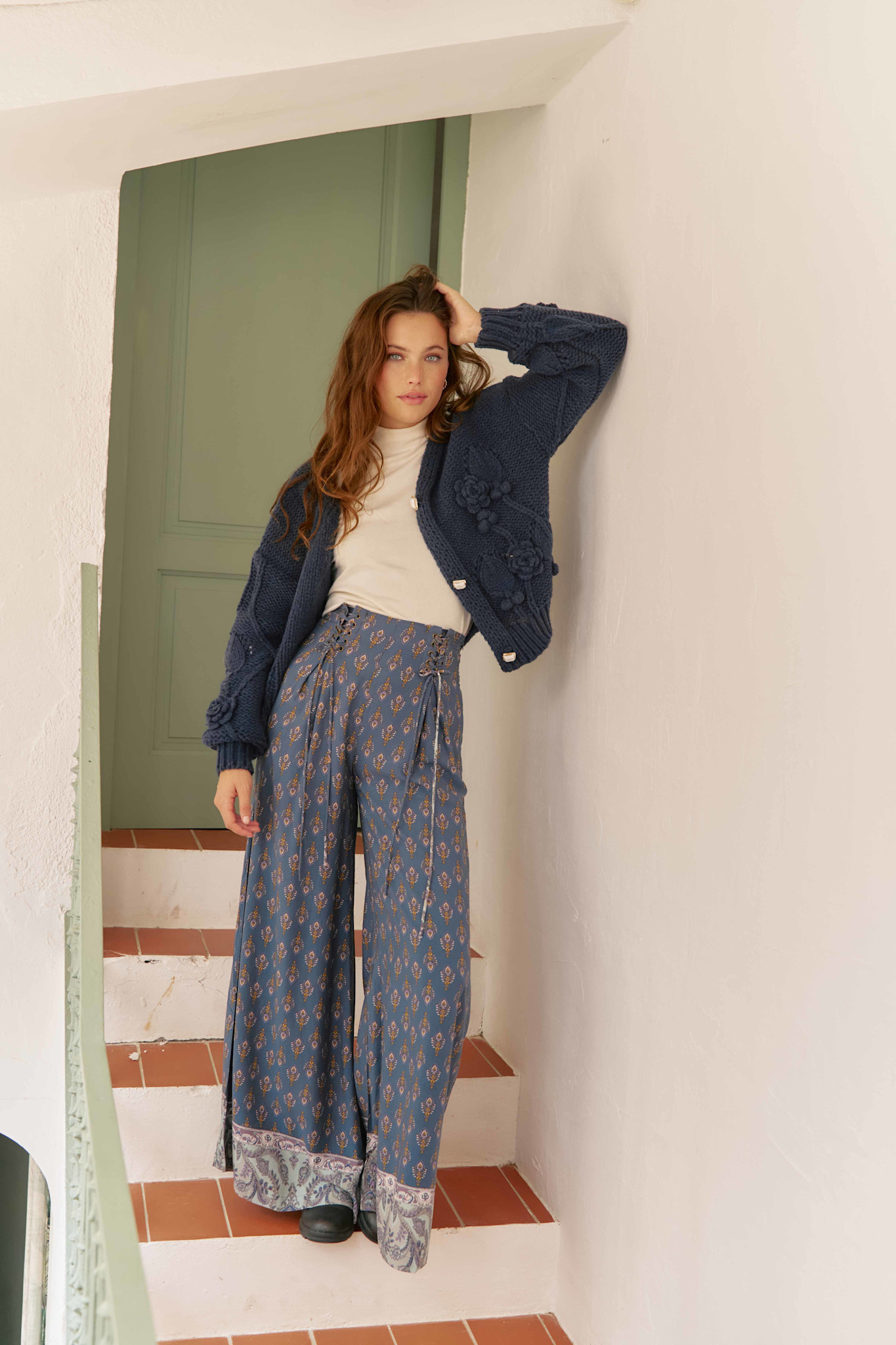 Het vest Navy cozy van het merk Jaase is een kort blauw vest bewerkt met een rozenpatroon. Het vest kan gesloten worden met knopen. Vorig jaar was dit model één van de bestsellers van de wintercollectie van Jaase.