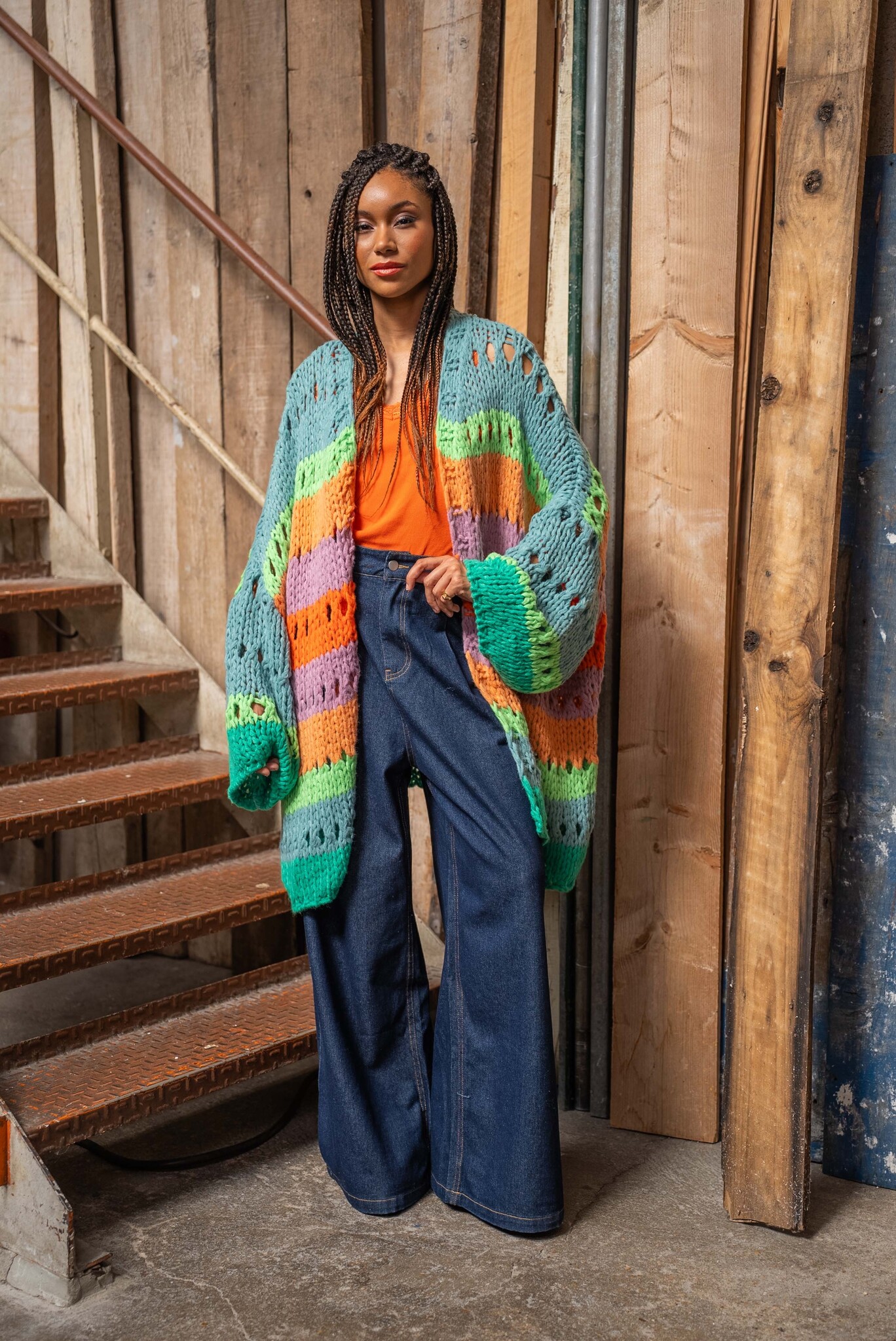 Een oversized kleurrijk gestreept vest. Het opengewerkte vest is van het merk Gold & Silver.