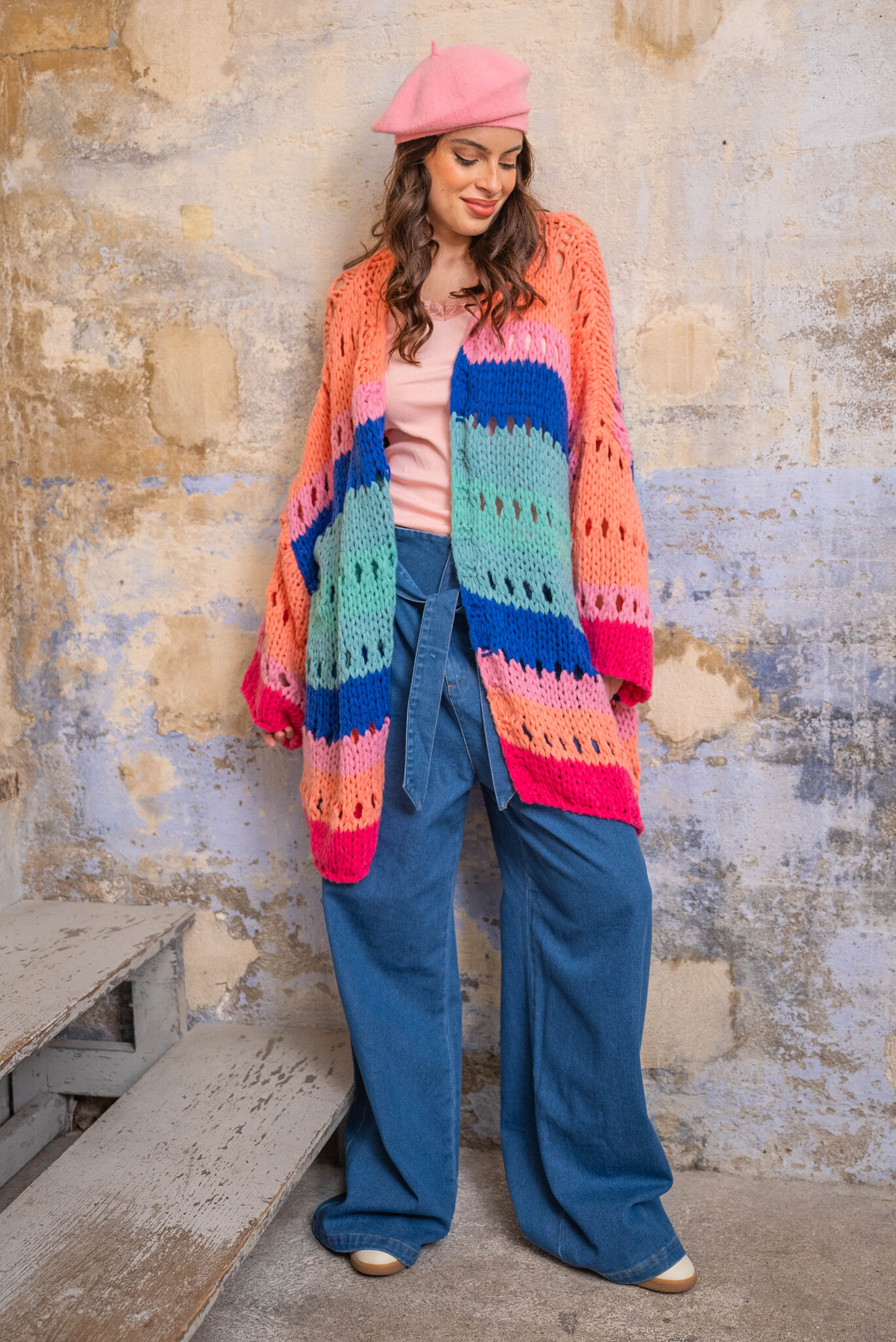 Een oversized kleurrijk gestreept vest. Het opengewerkte vest is van het merk Gold & Silver.