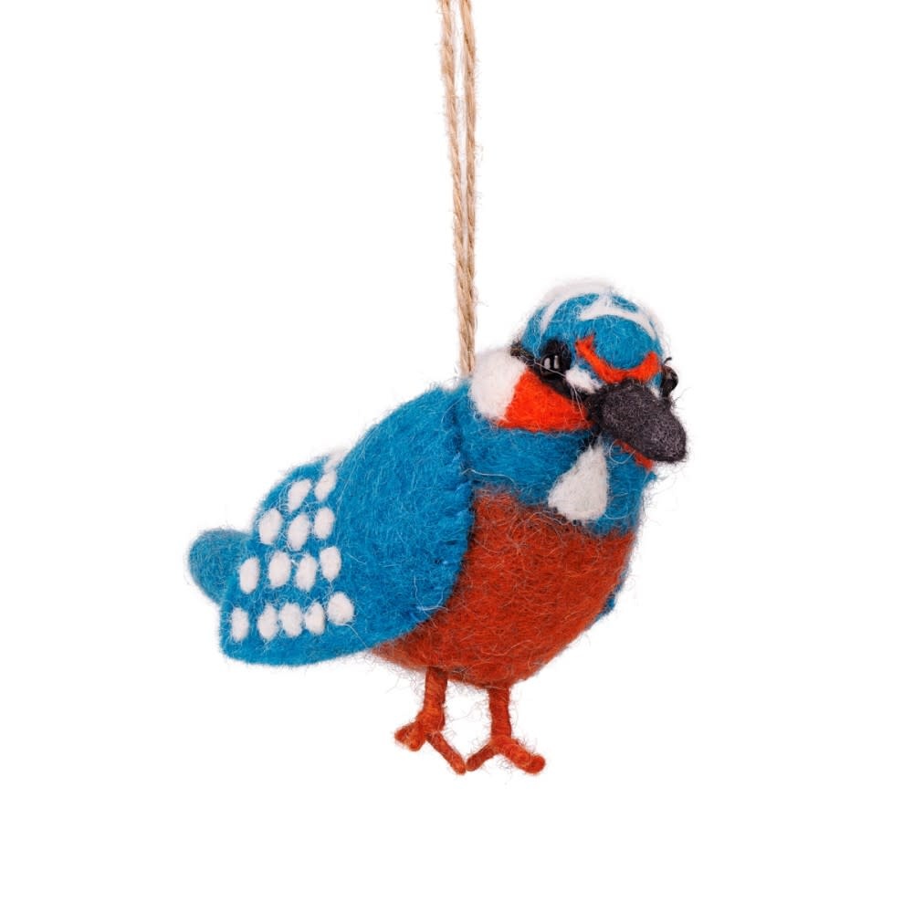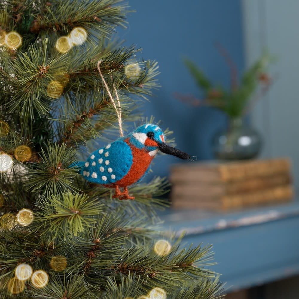 Deze ijsvogel van vilt is voorzien van een touwtje, zodat je hem eenvoudig kunt ophangen in de kerstboom, aan een tak of als speels accent in je interieur. Handgemaakt en vol aandacht voor detail, een vrolijke en unieke decoratie voor ieder seizoen.