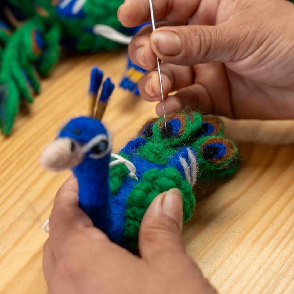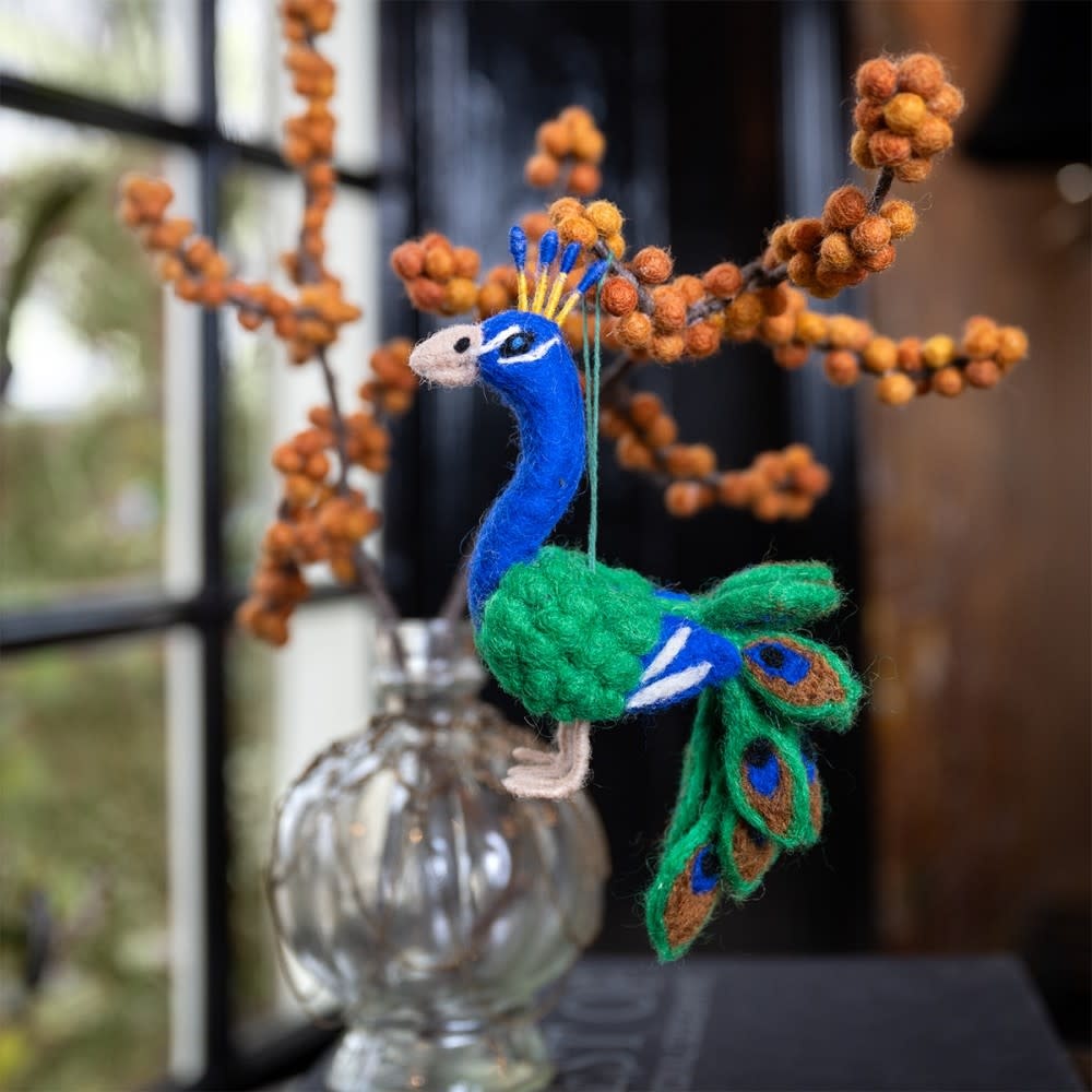 Deze sierlijke pauw van vilt is handgemaakt met oog voor detail. De decoratieve vogel brengt een vleugje elegantie en kleur in je interieur en is een unieke blikvanger op tafel, in een kast of als sfeervol accent in een seizoenshoekje.